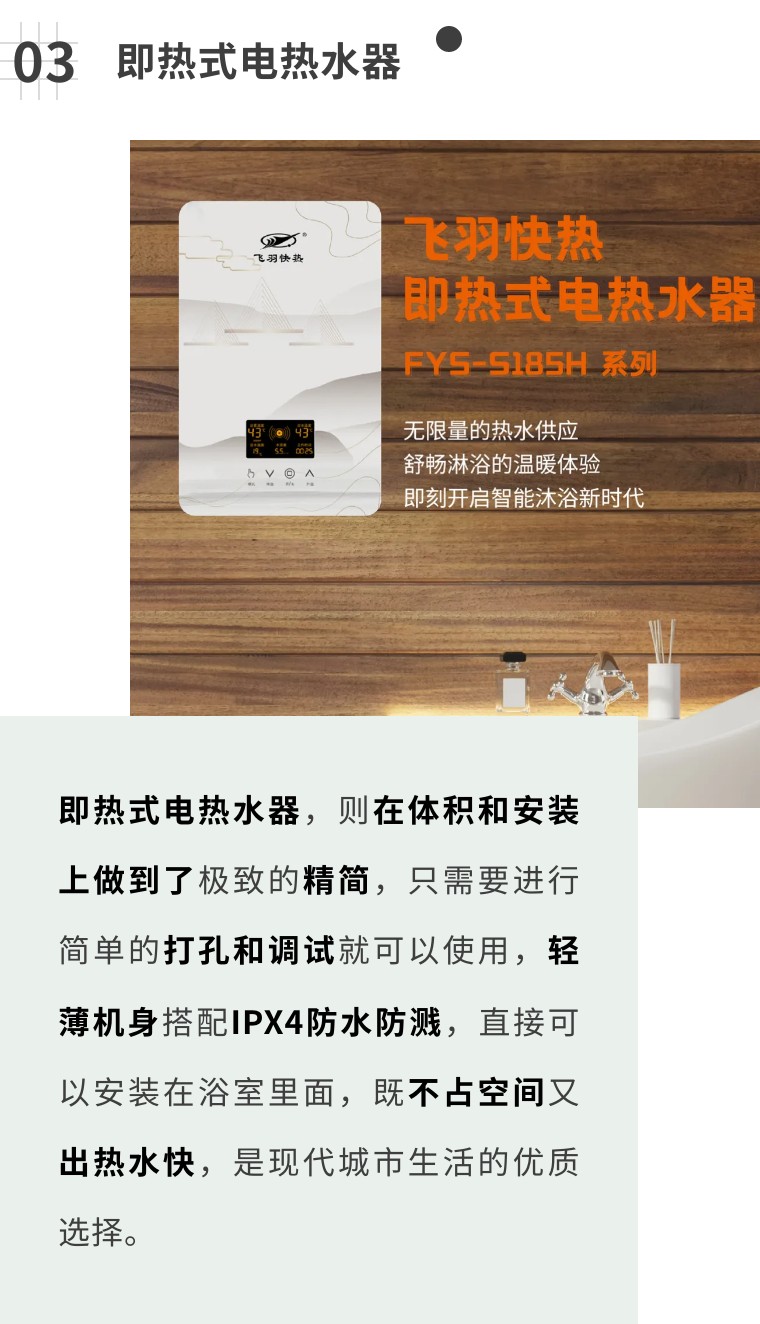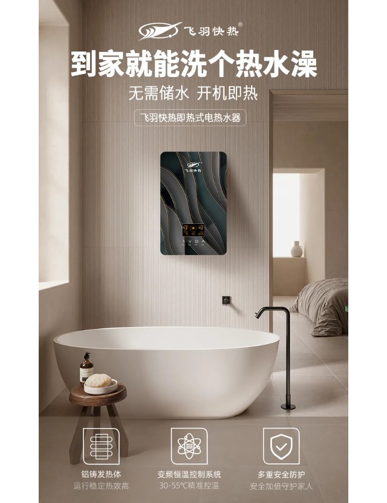 例如這臺飛羽快熱即熱式電熱水器,采用一體式全鑄鋁加熱體,無需儲水,即開即熱。不受天氣和光照的影響,洗澡時僅需開啟花灑,澎湃熱力,頃刻既達,享受想洗就洗的暢快。