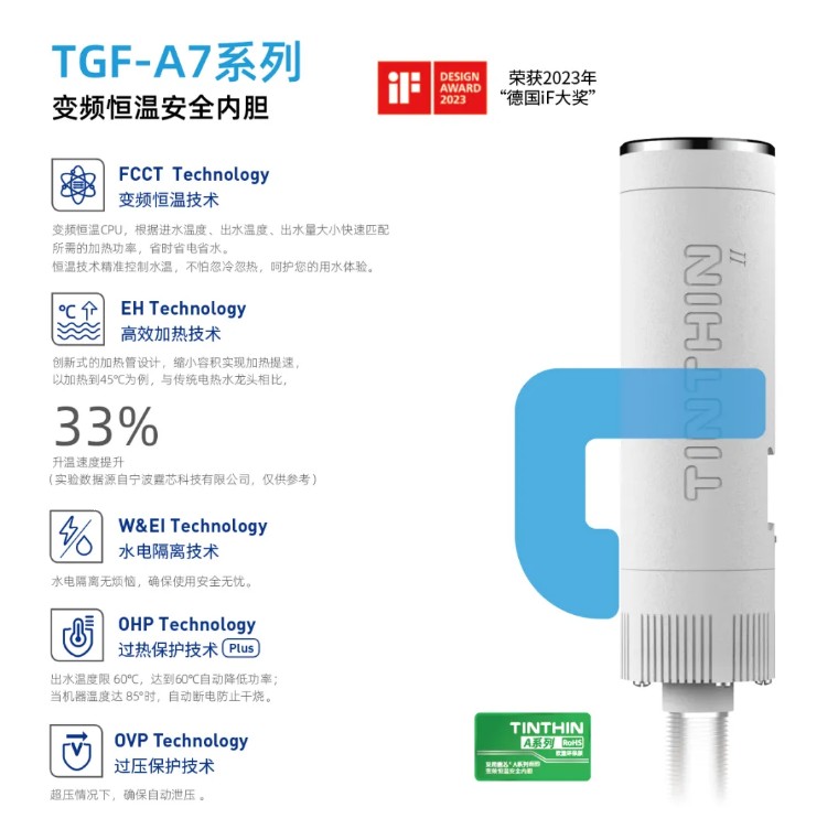 作為一款標準化的加熱模組,霆芯?高性能安全內膽以高效加熱技術為核心,以多項安全技術為保障,成功應用于電熱水龍頭、小廚寶、淋浴器、以及智能加熱類等產品領域,解決中小型即熱式企業的技術難點。