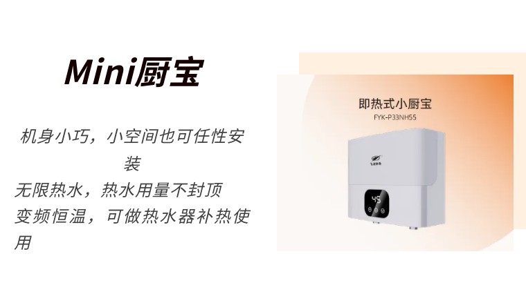 即熱式小廚寶機身迷你,可以非常完美地隱藏于各類廚衛櫥柜空間之中,使用場景靈活多變;內部采用全鑄鋁加熱體,熱效高壽命長,能夠提供源源不斷的溫暖熱水,還搭載變頻恒溫系統,可以給家里的太陽能熱水器和燃氣熱水器做補熱使用。