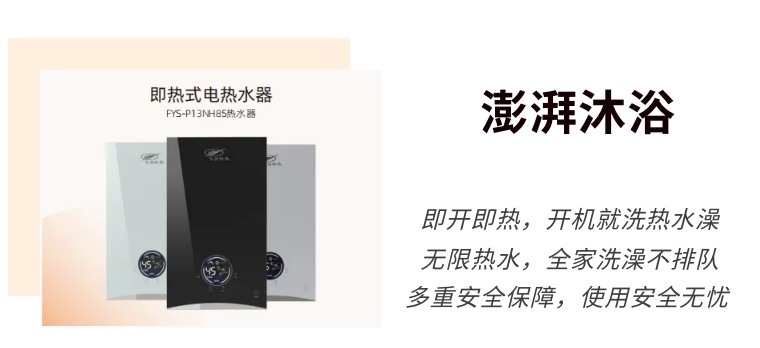 即熱式電熱水器則是適用于現代衛浴風格的美觀電器,超薄機身成就“浴室墻上一幅畫”,告別傳統電熱水器的臃腫。開機就洗熱水澡,全家洗澡不排隊。熱力澎湃無限洗,舒適恒溫每一刻。